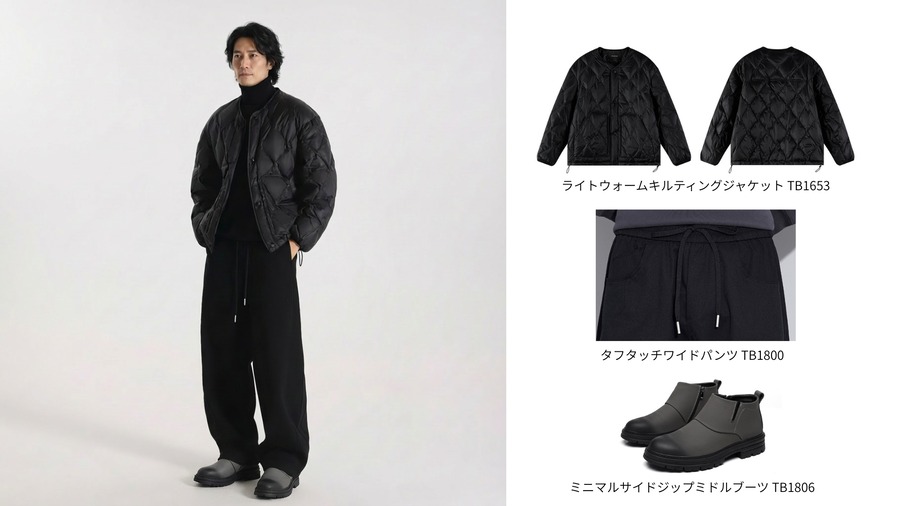 ライトウォームキルティングジャケット TB1653 ¥17,800 https://official.tidebreak.jp/items/126792088 タフタッチワイドパンツ TB1800 ¥7,480 https://official.tidebreak.jp/items/129216174 ミニマルサイドジップミドルブーツ TB1806 ¥7,980 https://official.tidebreak.jp/items/129893102